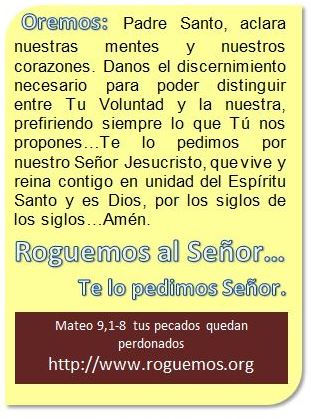 Padre Santo, inspíranos y danos la fuerza de voluntad necesaria para salir de la comodidad y del egoísmo para proyectarnos a nuestros hermanos, buscando siempre todo aquello que los conduzca a Ti, empezando por nuestro buen ejemplo…Te lo pedimos por nuestro Señor Jesucristo, que vive y reina contigo en unidad del Espíritu Santo y es Dios, por los siglos de los siglos…Amén.